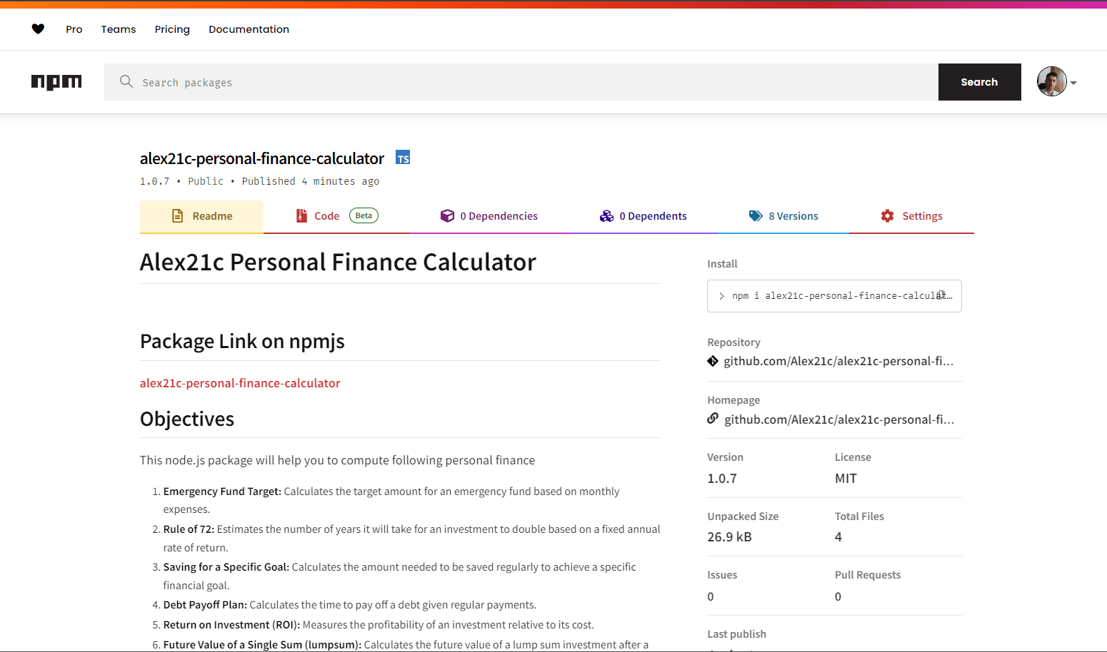 An important project maintenance signal to consider for alex21c-personal-finance-calculator is that it hasn't seen any new versions released to npm in the past 12 months, and could be considered as a discontinued project, or that which receives low attention from its maintainers.